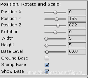 在Position,Rotate and scale面板中调整stamp的参数,消勾Ground Base可调整stamp的基础高度。