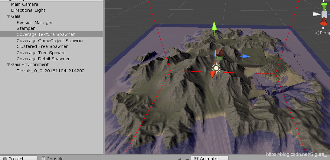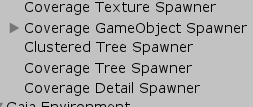 添加完地形后,在gaia manager中点击create spawners增加地图纹理。选择Coverage texture Spawner,点击脚本底下的spawner Controller中的spawn,添加预设的地图纹理。