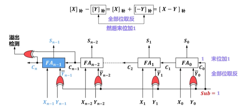 在全加器的的Y输入端添加一个异或门,sub=1表示减法运算,且将sub的值作为起始最低位的进位,实现反码+1的功能。