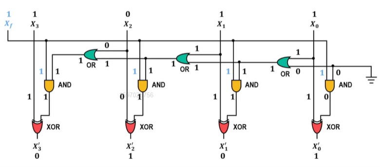 关键仍是异或门一端为0则保持原输出,一端为1则取反;与门的输出作为异或门的输入;或门的输出作为与门的输入。