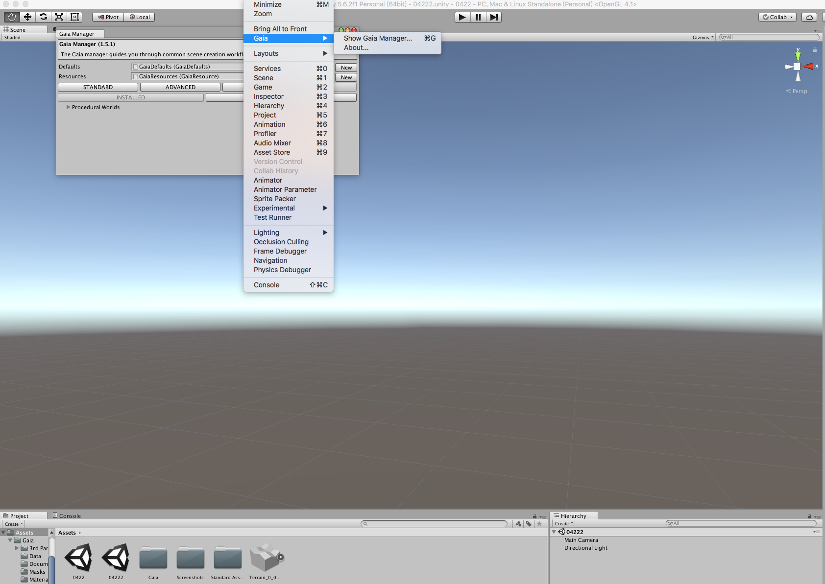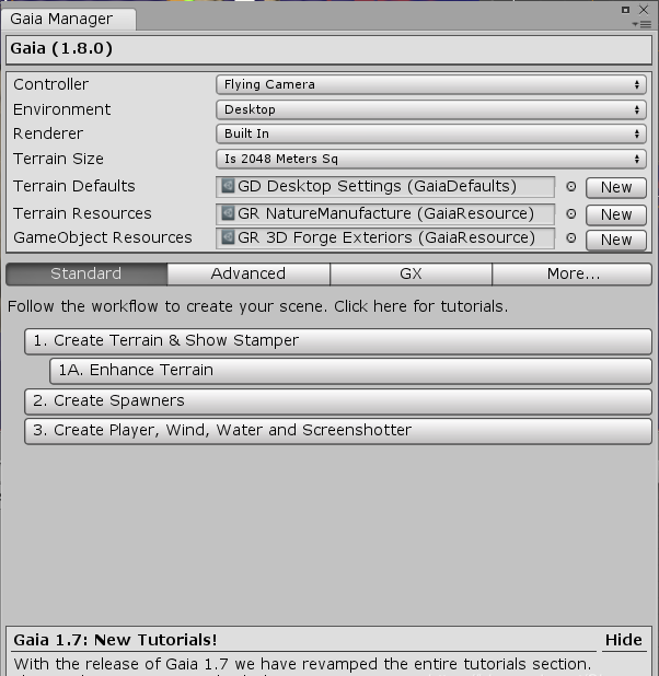 打开Unity,下载导入Gaia后,Ctrl+G或者“Windows—>gaia—>show gaia manager”呼出gaia manager。