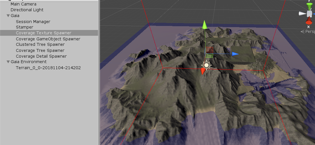 添加完地形后,在gaia manager中点击create spawners增加地图纹理。选择Coverage texture Spawner,点击脚本底下的spawner Controller中的spawn,添加预设的地图纹理。