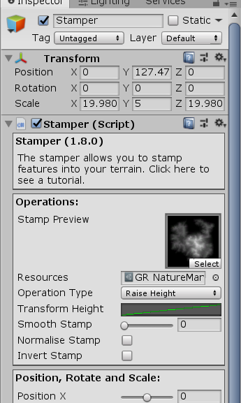 在Position,Rotate and scale面板中调整stamp的参数,消勾Ground Base可调整stamp的基础高度。