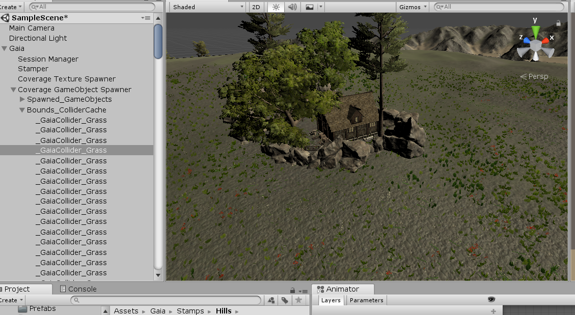 选择Coverage GameObject Spawner,点击脚本中的spawn按钮,可以自动在地形中添加预设的3D模型。