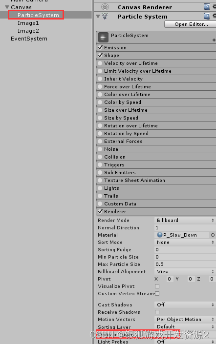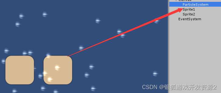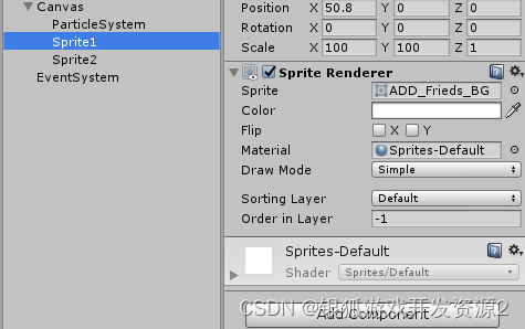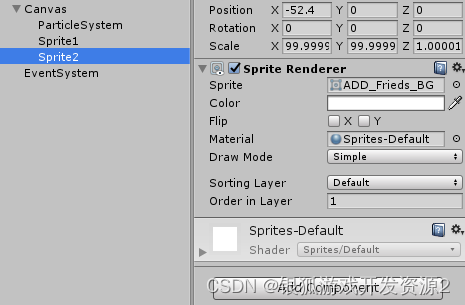 2.设置Sprite1的Order in Layer为 -1,设置Sprite2的Order in Layer为 1,粒子的Order in Layer成了 0,此时粒子夹在两张图片中间