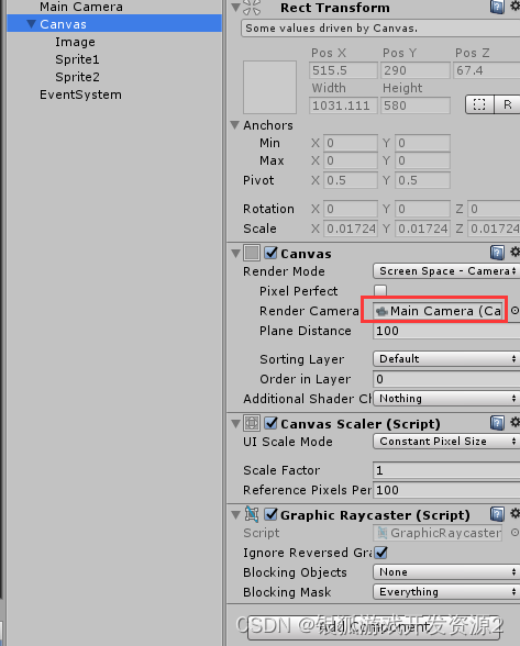 首先,必须保证Canvas画布的渲染模式为了相机渲染