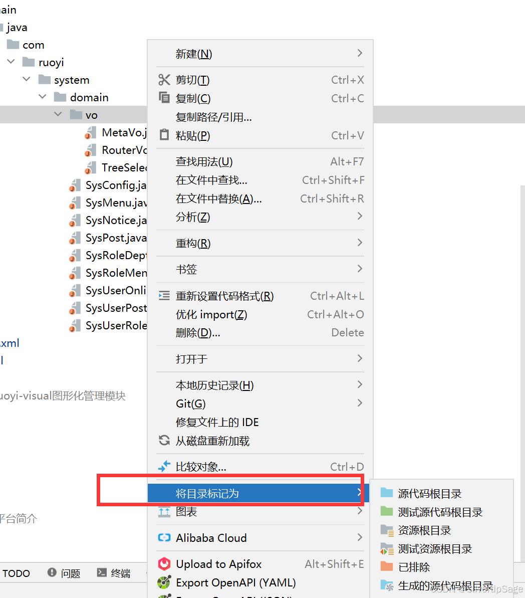 接着朝vo(当前选中的目录)的父级目录看,就会发现java目录标记出现了错误,将java目录的目录标记改一下,改成源代码根目录就ok啦