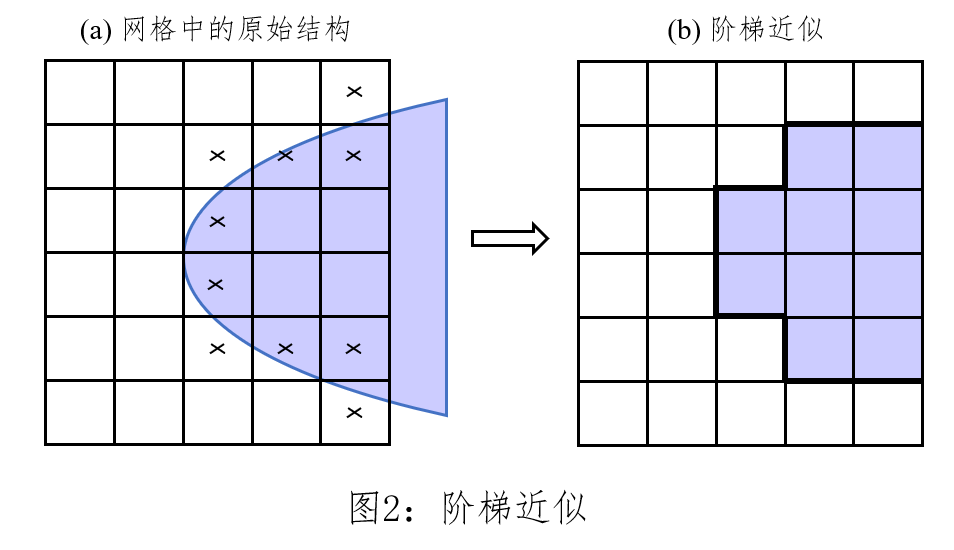 在均匀网格中,对于小于网格尺寸的结构一般使用网格中心点判断该网格处的材料参数,该处理方式称为阶梯近似,如下图所示。