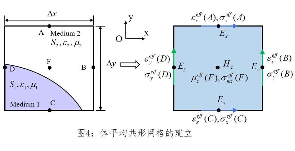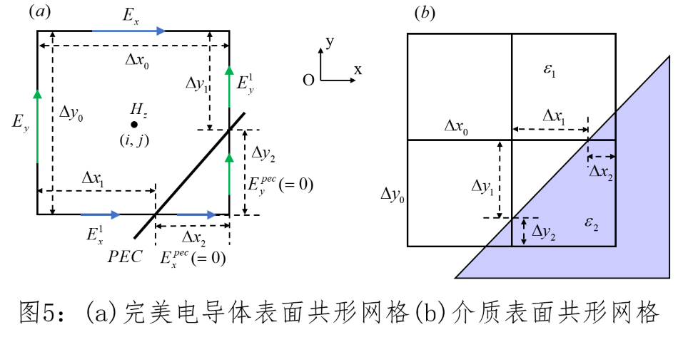 共形网格通过在网格细化方法上做出优化,能够得到Yee单元结构内的等效材料分布。在FDTD计算中,共形网格技术可以处理曲线边界、不规则形状等复杂情况,可以实现对复杂几何形状的精确建模和模拟,提高了模拟结果的准确性和计算效率。目前共形网格技术已经发展出多套理论和方法,对于该技术,在此简单地介绍两种以作了解。
