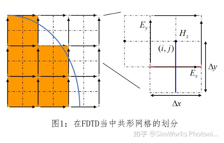 在FDTD方法当中,时间空间等均由Yee网格表示,这种离散方法也会带来一些系统性误差,例如网格色散等。此外,通过离散差分所能模拟的最小尺度即为一个网格,对于小于一个网格尺寸的结构,只能近似为一个网格,这将会给数值计算带来误差。当然最简单有效的办法是将网格划分得足够细,但这将需要更多的计算资源和时间。另一种方法则是使用共形网格,这种方法可以让整个计算区域的网格保持较大尺寸,同时,修正局部网格来减小误差。