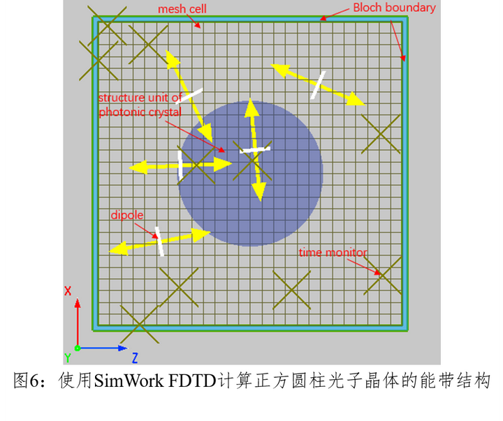 以下使用国产SimWork FDTD仿真软件[7]进行计算,下图为在软件中建立二维光子晶体元胞来求解能带结构。黄色箭头表示随机方向随机位置的偶极子源,用于激发所有的模式。布洛赫边界将使每次仿真后得到特定布洛赫波矢的频率响应,在足够的仿真时间后,不满足存在条件的模式光将消散。绿色的叉号表示随机位置的时间监视器,可确保捕获所有模式的电场,收集并相加,计算这些场的谐振频率,从而得到多个本征频率,使用布洛赫波矢扫描即可获得完整的能带图。