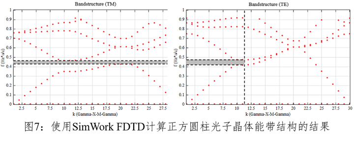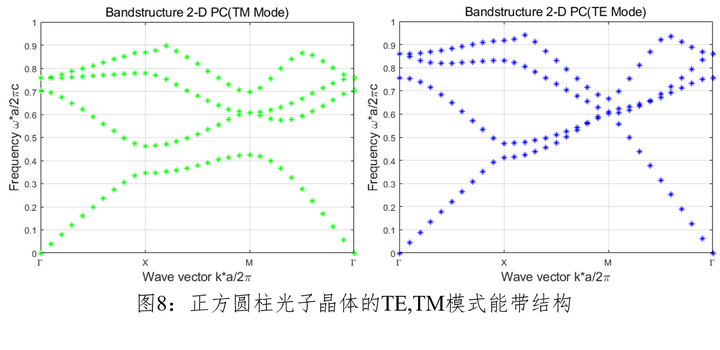 可以观察到TM模式下的能带结构有完整的光子带隙,而TE模式则仅有部分光子带隙,意味着该光子晶体能阻断处于光子禁带频率中的任意TM模式光传播,而对TE模式的光仅能反射部分角度的光。以上结果可在其官网案例库2D正方晶格能带结构中找到详细描述。