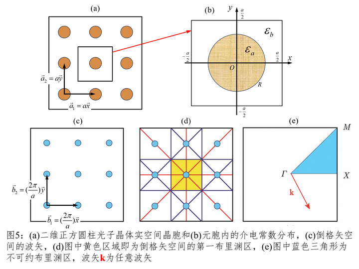 除此之外,光子晶体还拥有旋转对称性、镜像反射对称性以及反演对称性。对于一个给定的光子晶体,只需要将求解问题限制在单个元胞内即可。在布里渊区中无法通过对称操作得到的最小部分,即不可约布里渊区。如上图中(e)所示,简单正方晶格光子晶体的不可约布里渊区为三角形,其顶点分别位于中心 Γ \Gamma Γ 、角 M M M 和一条边 X X X 上,其中包含了布里渊区的所有信息。