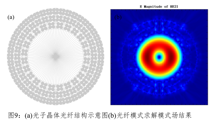 光子晶体光纤已经发展出多种构型,但其本质依然是基于点缺陷的光子晶体,这种光子晶体拥有极佳的聚焦和束缚效果,减小了光信号的在远距离传输时的损耗。下图为一种光子晶体光纤的高阶模式场图。