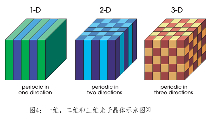 根据介质材料周期排列的方式,可分为一维、二维、三维光子晶体。一维光子晶体可以认为是由两种不同介电材料交替叠加形成的多层膜结构。而布拉格光栅是其中的一种特殊示例。这种简单结构也拥有光子晶体的最重要的特征,如光子禁带,满足布拉格条件的光将被反射。在二维光子晶体中,波长处在禁带中的光在平面内任何方向入射均会被反射。引入点缺陷或者线缺陷时,可以将光局域在该缺陷处,或者将光限制在该缺陷内传播。可以利用这种缺陷态可以制作各种光波导器件。三维光子晶体则有着更为复杂的晶体结构和缺陷构造,人们依然最关心那些存在完全带隙的晶体结构。目前研究表明,拥有大完全带隙的光子晶体都和金刚石结构有着紧密的关系[5]。