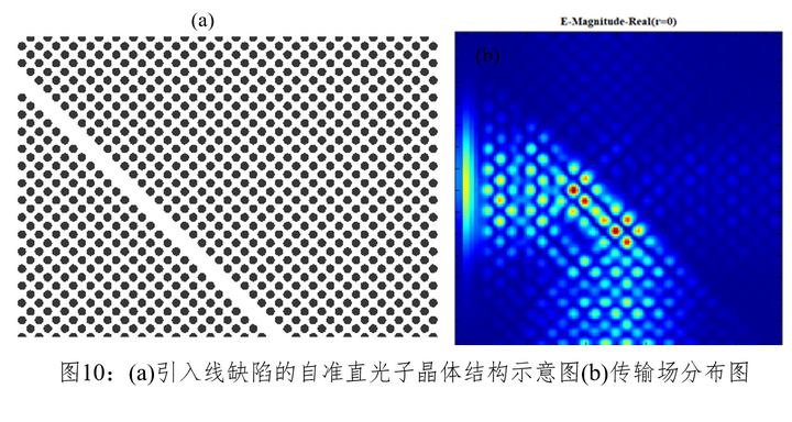 基于线缺陷的光开关也已经发展地十分成熟,有多种不同的变型。以下为在自准直光子晶体中引入线缺陷后的传输场分布图。入射光沿特定方向入射到该光子晶体中,光束几乎不发生衍射沿直线传播,而引入线缺陷将导致自准直光束发生弯曲和分裂,此时入射光将在缺陷界面处发生完全反射。