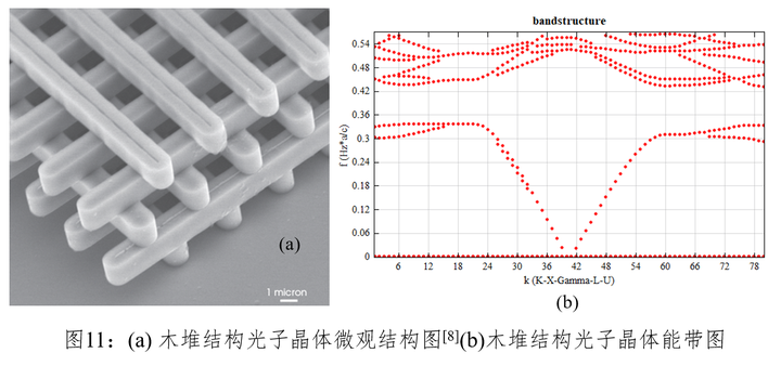 三维光子晶体基本的面心立方以及体心立方晶格都没有完全带隙。而木堆晶体结构是人们研究制造的第一个拥有完全带隙的微米级三维光子晶体[8]。下图为进行波矢扫描得到的木堆光子晶体的能带结构图。