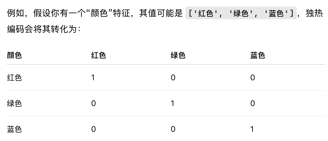 例如,假设你有一个“颜色”特征,其值可能是 ['红色', '绿色', '蓝色'],独热编码会将其转化为: