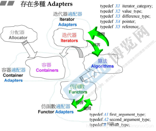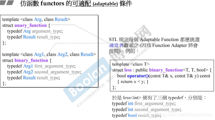 仿函数能被修改,被适配(adaptable),被调整的话就要选择适当的 u / b function 来继承,才能真正融合到 STL 中。被 adapter 改造时 adapter 可能会提问这些 typedef 的问题(类比于算法提问迭代器中 typedef 的五个问题)。