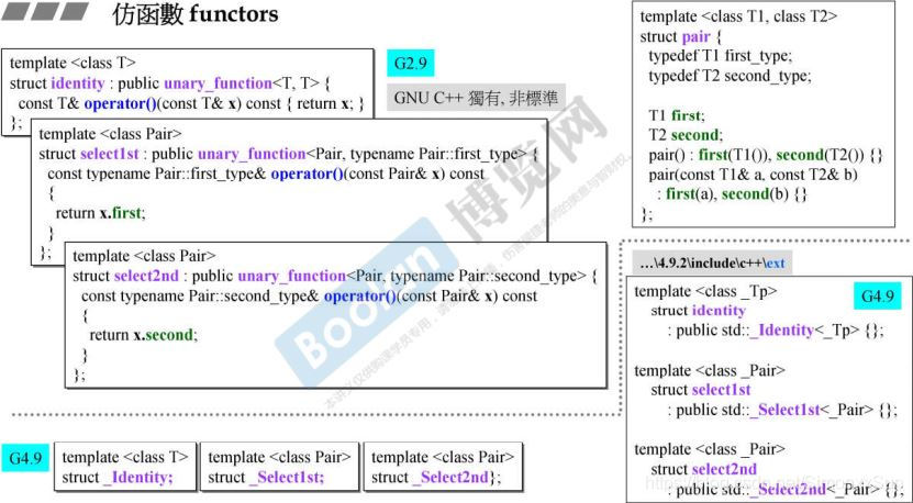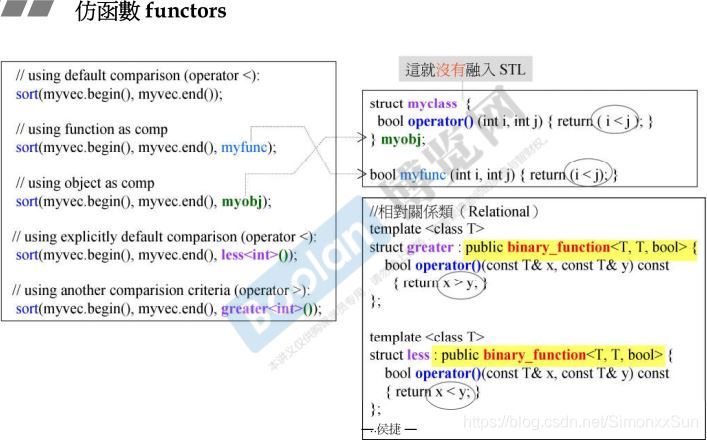 标准库所提供的仿函数都有继承关系,用户定义的 functor 如果没有继承特定的类,那么就没有融入 STL 的体系结构里面。