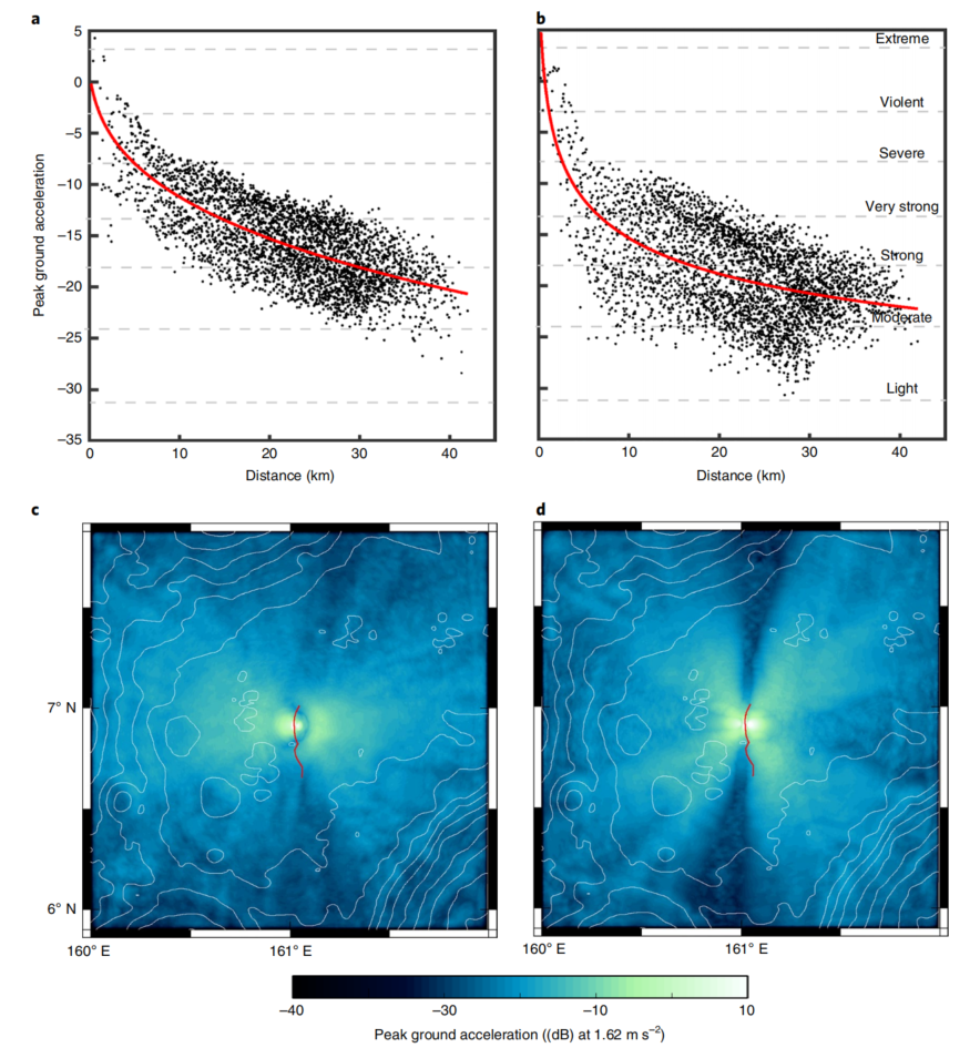 图3 | Mandel’shtam冲断带逆冲断层滑动事件的地震动图及预期地面运动。a-d图分别展示了震中垂直向(a)和水平向(b)震动衰减曲线,以及6.36级震源(北纬6.91°、东经161.02°、深度350米的峰值垂直加速度(c)和水平加速度(d)震动图。c和d图中红色线条标示Mandel’shtam逆冲断层,白色等高线(等高距500米)表示区域地形。加速度以分贝值表示(1分贝=20log10(A/Aref),其中A为振幅,Aref为月球参考重力加速度1.62 m/s²),因此40分贝差异对应约100倍的振幅衰减。a和b图中的红色曲线为垂直与水平运动分量数据点分布的最佳幂律拟合线(决定系数r²分别为0.54和0.33)。