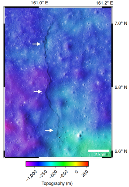 图1 | 位于月球背面高地(北纬6.9°,东经161°)的曼德尔施塔姆(Mandel'shtam)撞击坑群中显著的叶状逆冲断层崖(lobate thrust fault scarp),是通过月球勘测轨道飞行器相机(LROC)图像发现的数千处断层之一。利用LROC NAC立体影像(帧号M191895630和M191909925)生成了曼德尔施塔姆断层崖的数字高程模型。该断层崖(白色箭头标示)最大起伏约70米。数字高程模型水平空间尺度为5米/像素(NAC立体影像分辨率约1米/像素),垂直精度约0.5米。高程基准参考半径为1,737,400米的球体。