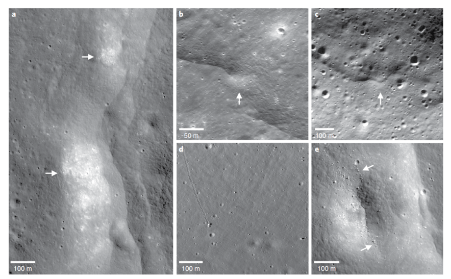 图6 | 重新定位的浅层月震附近断层陡坡近期活动性的可能证据。a,维泰罗簇(34.4°S,37.9°W)一处显著的叶状陡坡。具有较高反照率月连续谱特征的巨石场出现在陡坡面和背坡地形上(白色箭头)。月球轨道器相机窄角镜头图像框M190844037LR。b,双子座αC叶状陡坡(36.1°S,18.7°E)坡面的反照率特征(白色箭头)。该陡坡距最近重新定位震中约120公里。窄角镜头图像框M124449632R。c,穆谢L叶状陡坡(77.9N,36.3°W)坡面的反照率特征(白色箭头),距最近hird震中约25公里。窄角镜头图像框M1119172889L。d,北山脉斜坡(20.3°N,30.8°E)的巨石及滚石轨迹,位于Lee-Lincoln scarp以东约5公里处。大型滚石为阿波罗17号6号测站滚石。该陡坡距Taurus–Littrow valley最近重新定位震中约11公里。窄角镜头图像框M134991788R。e,维泰罗簇某叶状陡坡(34.69°S,37.89°W)背坡地形中直径约300米的退化撞击坑内,滚石呈平行于断层陡坡走向的排列方式。窄角镜头图像框M190844037L。