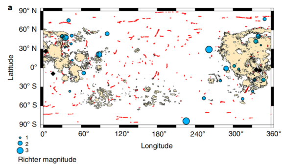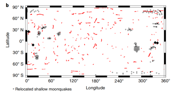 图2 | 显示年轻叶状逆冲断层陡坎位置与浅月震分布的地图。a图中标注了3543处叶状陡坎(红色)、已公布的浅月震震中位置(蓝色圆点),以及阿波罗月震台网 seismometers(黑色菱形)的分布位置。月震符号大小按估算的里氏震级进行比例缩放。月海玄武岩单元以棕褐色标示。