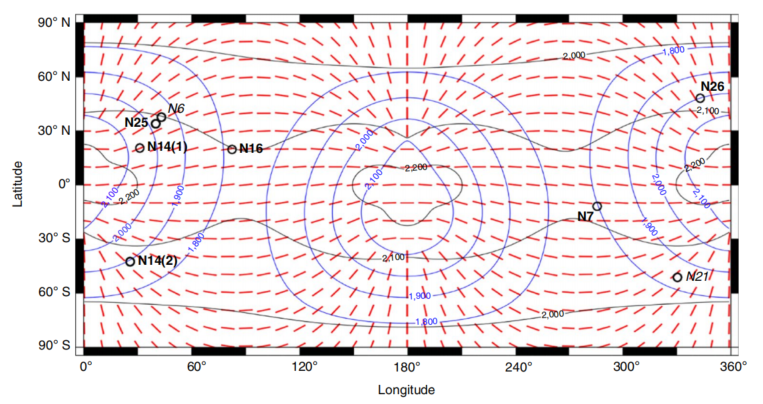 图5 | 月球当前近地表应力状态图。综合模型应力包括:(1) 全球收缩产生的2兆帕各向同性压应力,(2) 轨道离心作用,(3) 真实极移3°效应,以及(4) 远地点处的昼夜潮汐应力。最大压应力与最小压应力等值线分别以黑色和蓝色标示(100千帕等值线间距)。红色线条表示最大压应力方向。黑色圆圈(N#)标注远地点附近发生在断层崖30公里范围内的浅源月震,同时展示距断层崖60公里范围内的月震事件(N#)(参见图4a)。