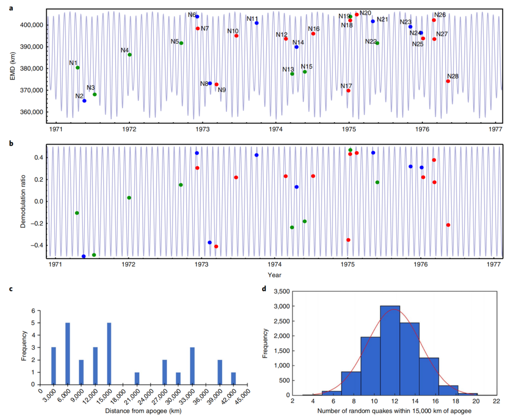 图4 | 阿波罗地震实验期间的近地点距离变化。a、浅层月震以圆点表示,颜色代表震中重定位云分类(红色:confirmed;蓝色:binary;绿色:fragmented)。除月周期变化外,还可观察到由太阳摄动引起的206天长周期调制。b、解调图消除了太阳摄动导致的206天周期,仅保留月周期变化。在18次近地点事件中,6次接近远地点,12次远离远地点。c、浅层月震发生时与远地点的距离直方图。28次浅层月震中,有18次发生在月球距离远地点不足15,000公里范围内(定义为近远地点事件)。d、在10,000组随机生成的28次地震中,距离远地点15,000公里范围内事件数量的直方图。这些随机地震事件的时间分布介于首次和末次记录的浅层月震之间且均匀分布。近地点15,000公里范围内的随机地震数量(红线)与正态分布高度吻合。