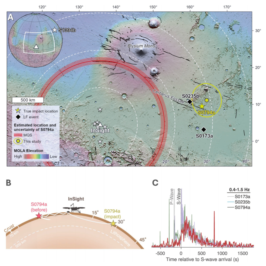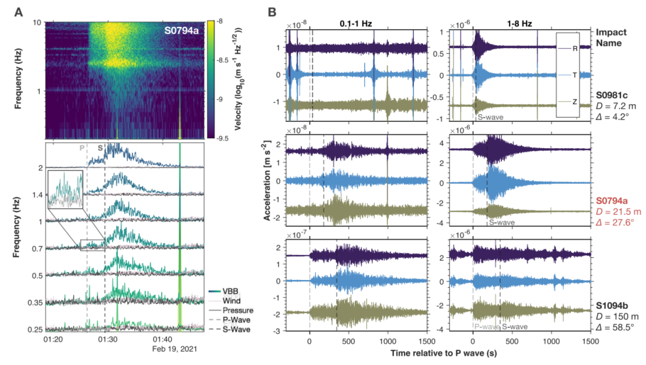 附近确认的撞击事件因其能量带宽延伸至35Hz(Ceylan等人,2022),均被归类为高频(HF)家族中的甚高频(VF)事件;这为将VF事件视为撞击提供了初步依据(Zenhäusern等人,2024)。S0794a信号与新撞击坑的关联首次直接证明:至少有一种不伴随声学"啁啾"特征的VF型事件属于撞击,支持了"多数(或全部)VF事件具有相同起源"的假说(Zenhäusern等人,2024)。