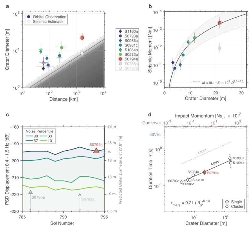 对先前确认的撞击事件分析发现,震源持续时间与陨石坑直径D存在幂律关系:τ ∼ D0.36 ± 0.04(图4d)。该比例关系基于直接观测数据,未引入模型假设。S0794a的4.5Hz截止频率与21.5米直径陨石坑的对应参数,恰好位于邻近撞击组与远距撞击组之间,与此比例关系相符。