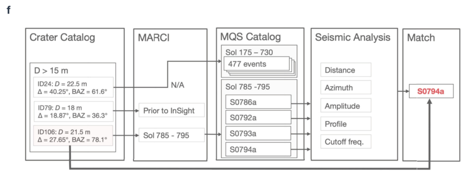 对于ID24号陨石坑,在缺乏MARCI更严格约束的情况下,有477次潜在地震事件落在CTX定义的时间窗口内(图1f)(洞察号火星震服务,2023年)。因此无法为ID24确定唯一匹配项。