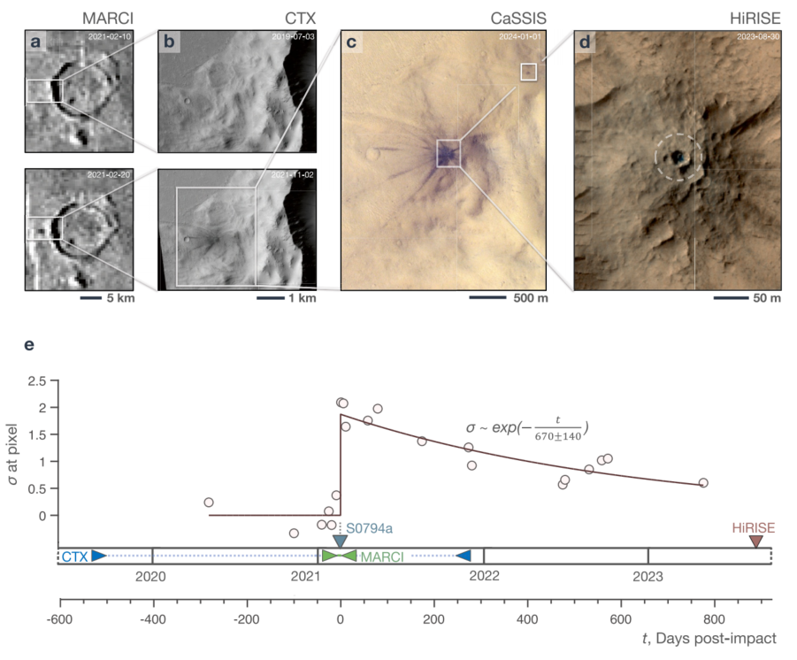 该结果首次呈现了通过MARCI单像素识别的撞击观测,也是首次实现对后续衰减现象的高频轨道追踪——这是高分辨率成像无法实现的。撞击时间窗口内观测到的反照率阶梯式下降及随后逐渐恢复的现象(图1e),与先前高分辨率影像中观测到的火星小型撞击坑和爆炸区的特征相符(I. Daubar等人,2016年研究),该现象归因于大气冲击波清除高反照率表面尘埃后,尘埃沉降导致了预期的非线性恢复速率。