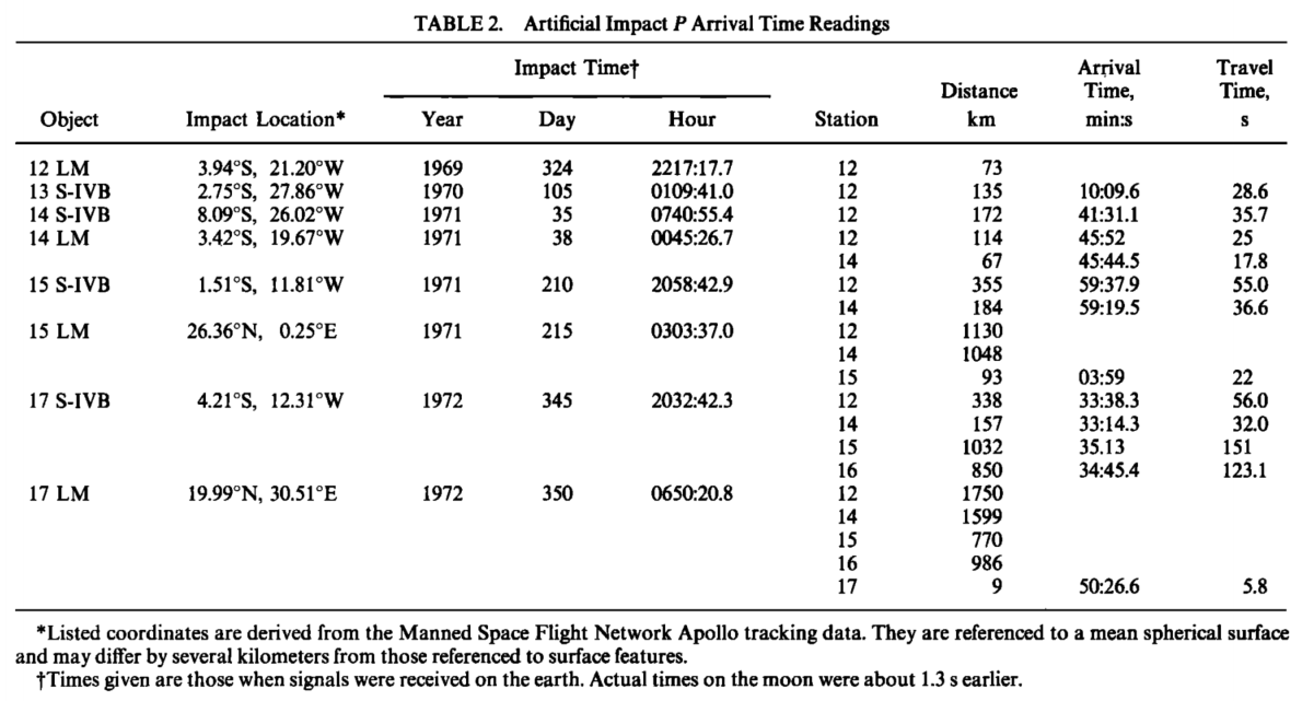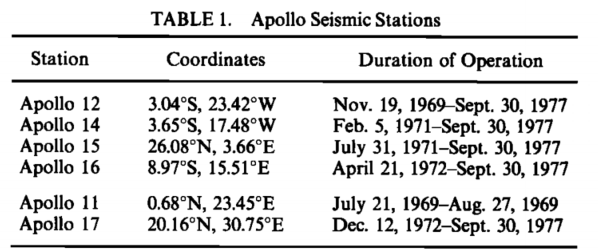 我们现在所掌握的几乎所有与月球深部相关的震波到达时间数据,均来自阿波罗登月计划期间建立的六座地震台站中的四座(如表1顶部所列)。除阿波罗17号站点外,每个台站均配备了三分量长周期地震仪和短周期垂直地震仪,仪器细节详见Latham等人1969年的研究。