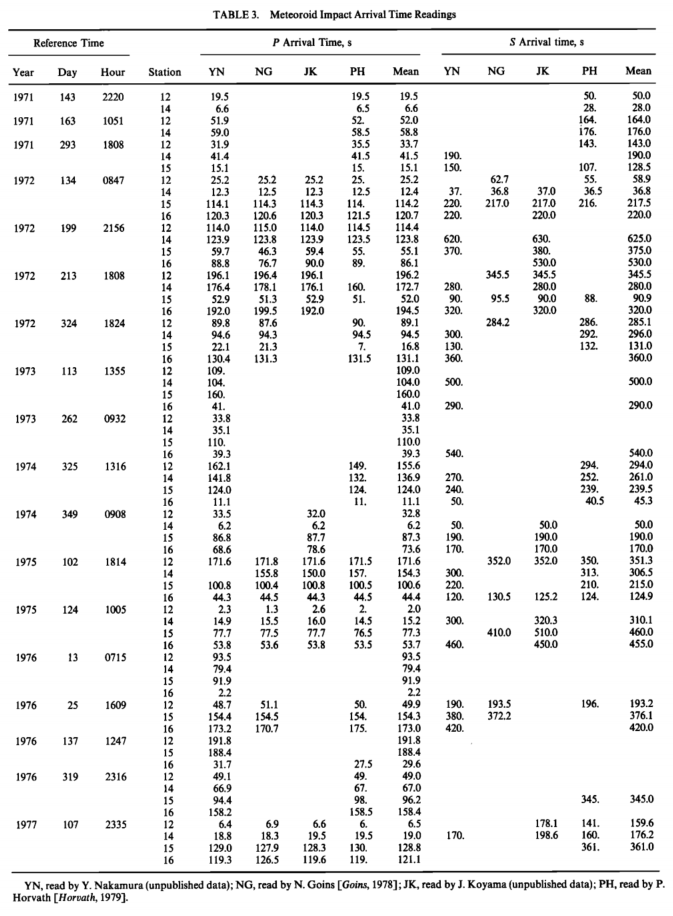在长达8年的观测期间,长周期地震仪共检测到1700多次大型流星体撞击事件,其中27次事件的规模足以在所有运行中的测站标准压缩地震图上记录到至少10毫米的振幅。(长周期仪器检测到的全部12,558次地震事件及其测量振幅均收录于Nakamura等人[1981]的研究中,文中对振幅测量方法进行了说明。)我尝试读取这27次事件的到达时间,但不得不剔除其中9次——或因信号过弱,或因噪声水平过高,且此前未有研究者对这些事件进行过任何到达时间测量。剩余18次事件的到达时间读数由四位独立研究者测定,详见表3。