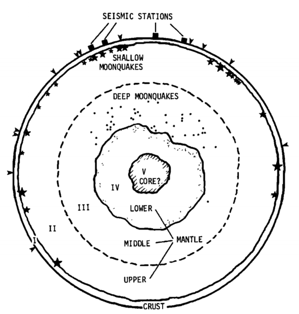 图1. 月球横截面示意图,展示月球内部主要特征及阿波罗地震站与震源定位点位置。(改编自Nakamura等人[1982]的研究成果,并添加箭头标注的主要陨石体撞击位置。)