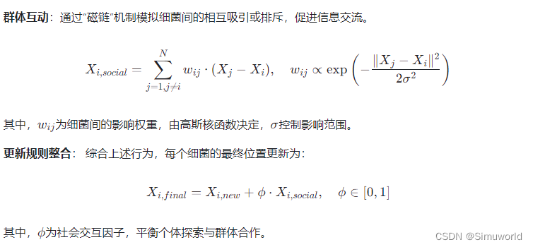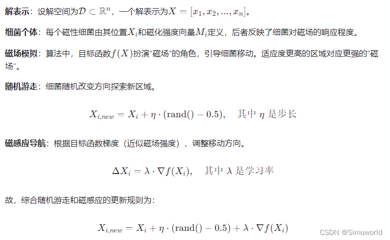 磁性细菌优化算法是一种新兴的仿生优化方法,灵感来源于自然界中的磁性细菌(如趋磁性细菌)的行为。这类细菌能够感知地球磁场并利用其体内的磁小体进行定向移动,以寻找更适宜生存的环境。MBO算法模拟了这一生物现象,将其转化为解决工程优化问题的有效策略。MBO算法的核心在于模拟磁性细菌的群体运动特性,包括随机游走、磁感应导航以及群体互动行为。算法通过构建虚拟磁性细菌群落,利用个体与群体的相互作用,在解空间中搜索全局最优解。