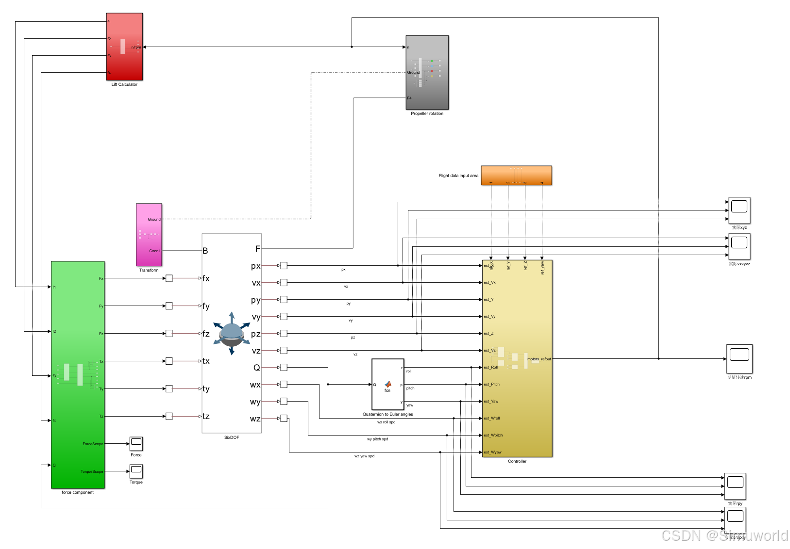 偏航运动(ψ 角):反向电机阻力矩差产生偏航力矩(顺转电机阻力矩增大、反转电机减小→机身顺时针旋转);