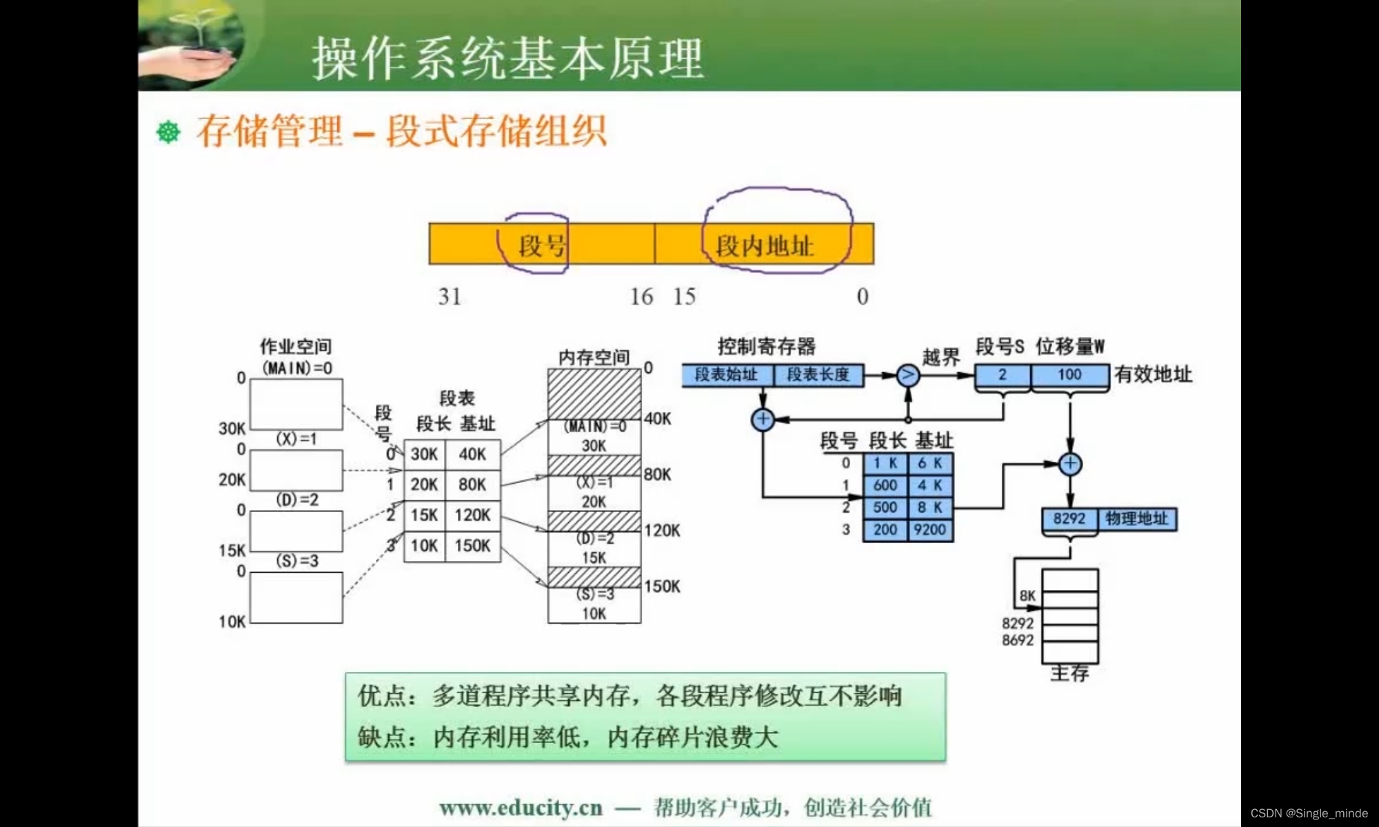 存储方式是按空间来定,根据段的大小在内存空间切出相应的段,与页式存储不同,页表是固定分割。