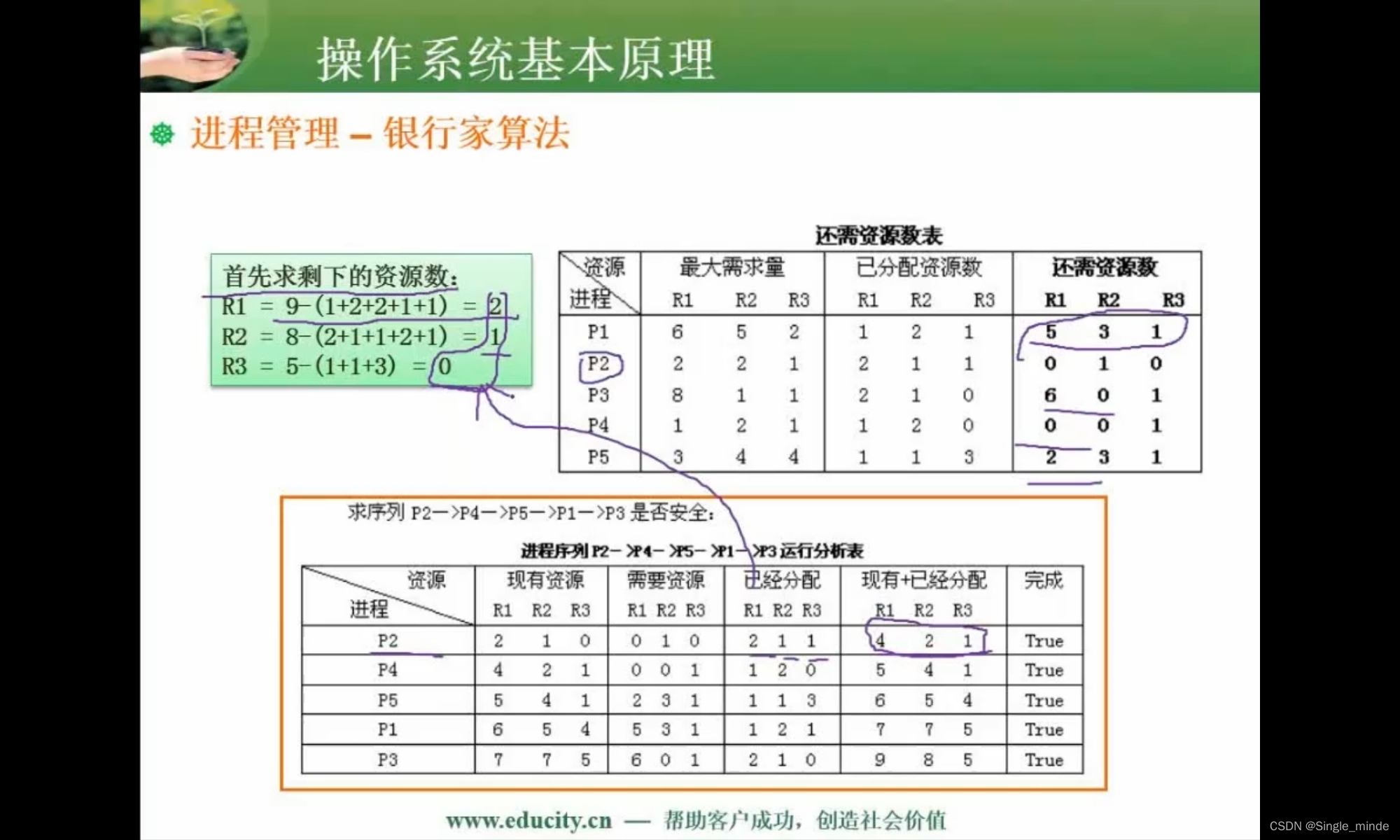 对于上述题目,首先我们得计算出,系统每个进程 剩下的资源数。