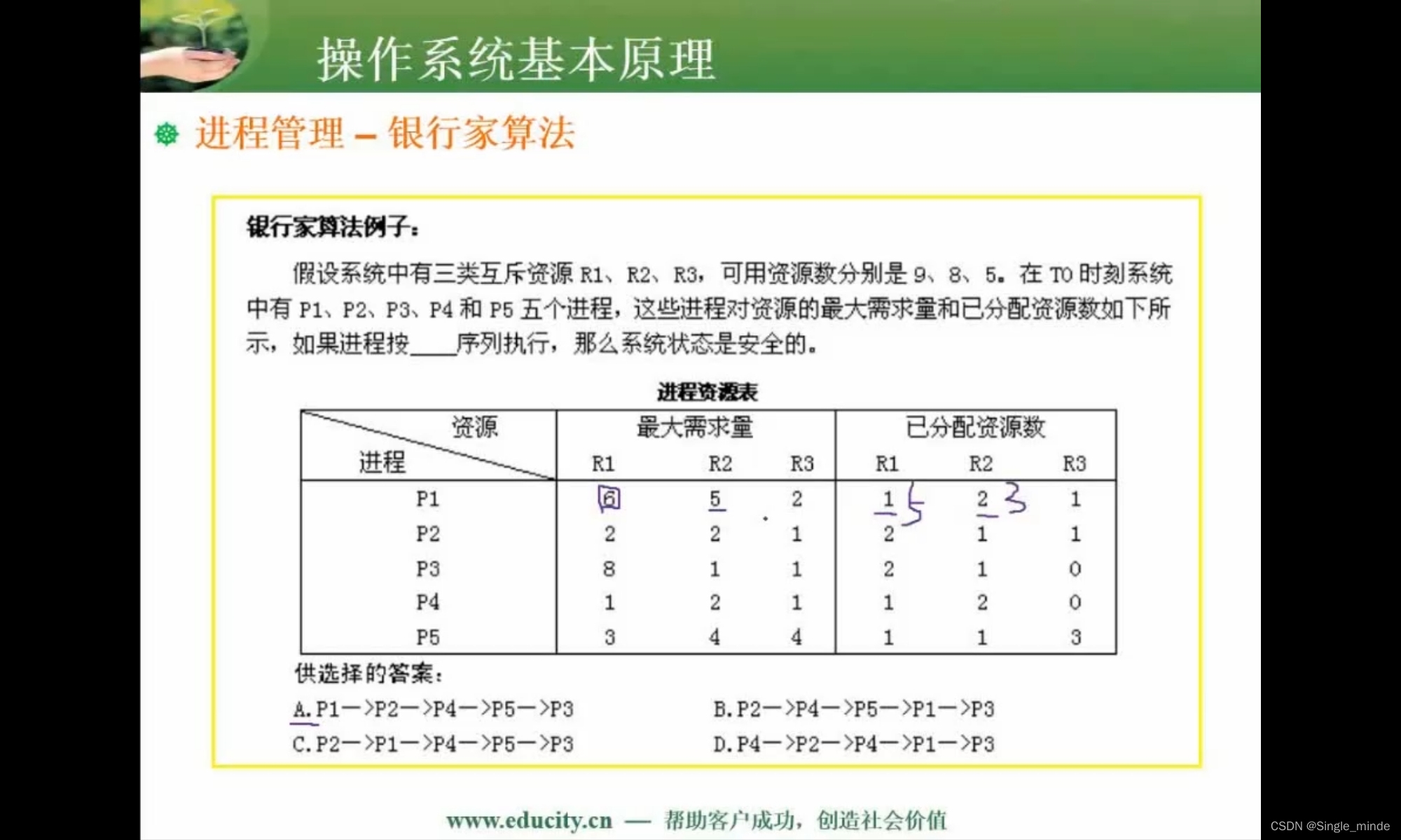 银行家算法:一般可以把选项代录,判断哪些能正常运行。