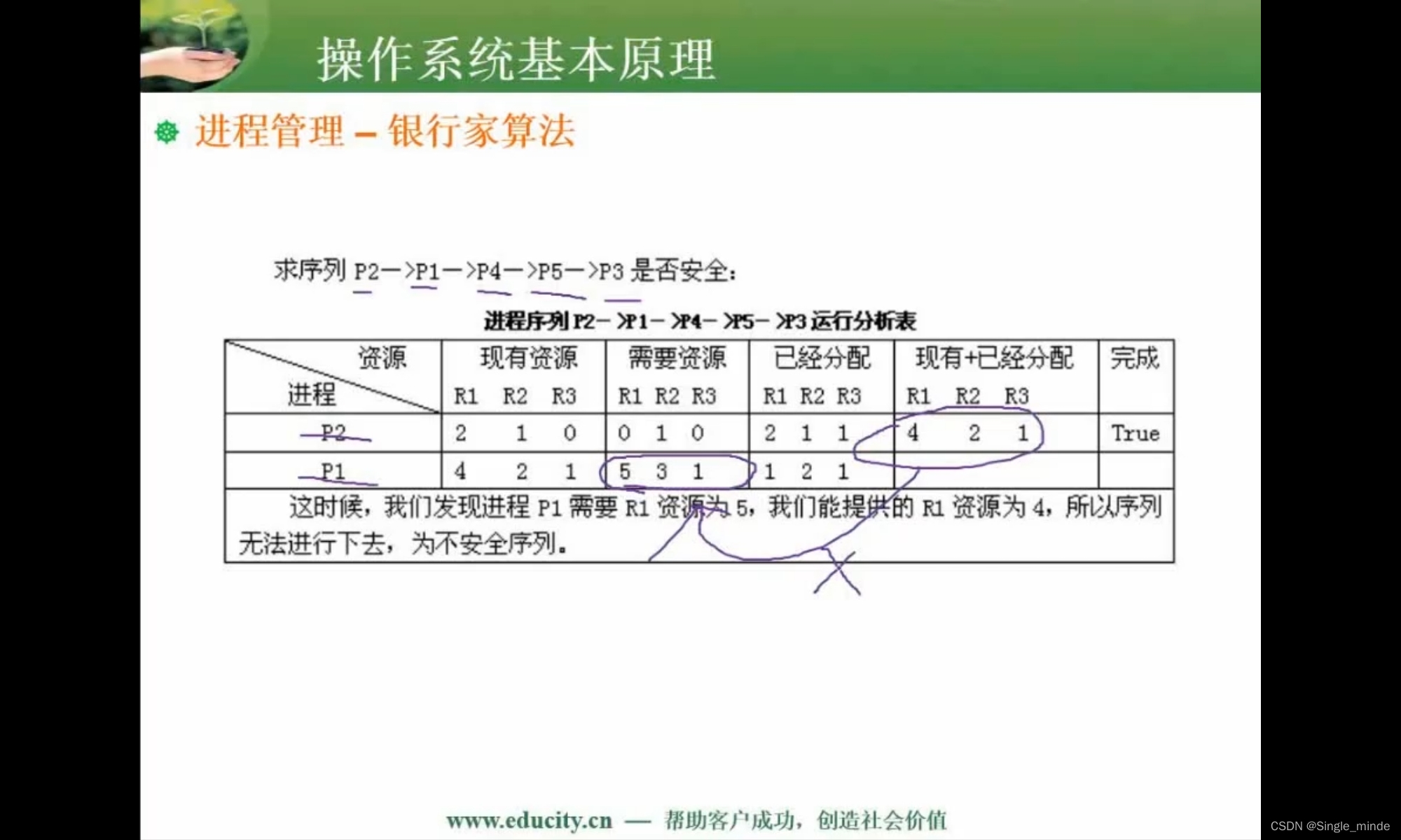 然后去判断哪个进程可以先实行,并且不会出现死锁,进程的优先级,主要是为了保证没有死锁的条件下,完成进程释放资源。如系统剩下的资源数为R1=2,R2=1,R3=0,那么此时只能选择P2进程,因为P2进程只需要(2,2,1),而系统已经分配(2,1,1),在进程结束后,资源数又增加为(4,2,1),一次类推,就可以找到最合适的进程顺序。