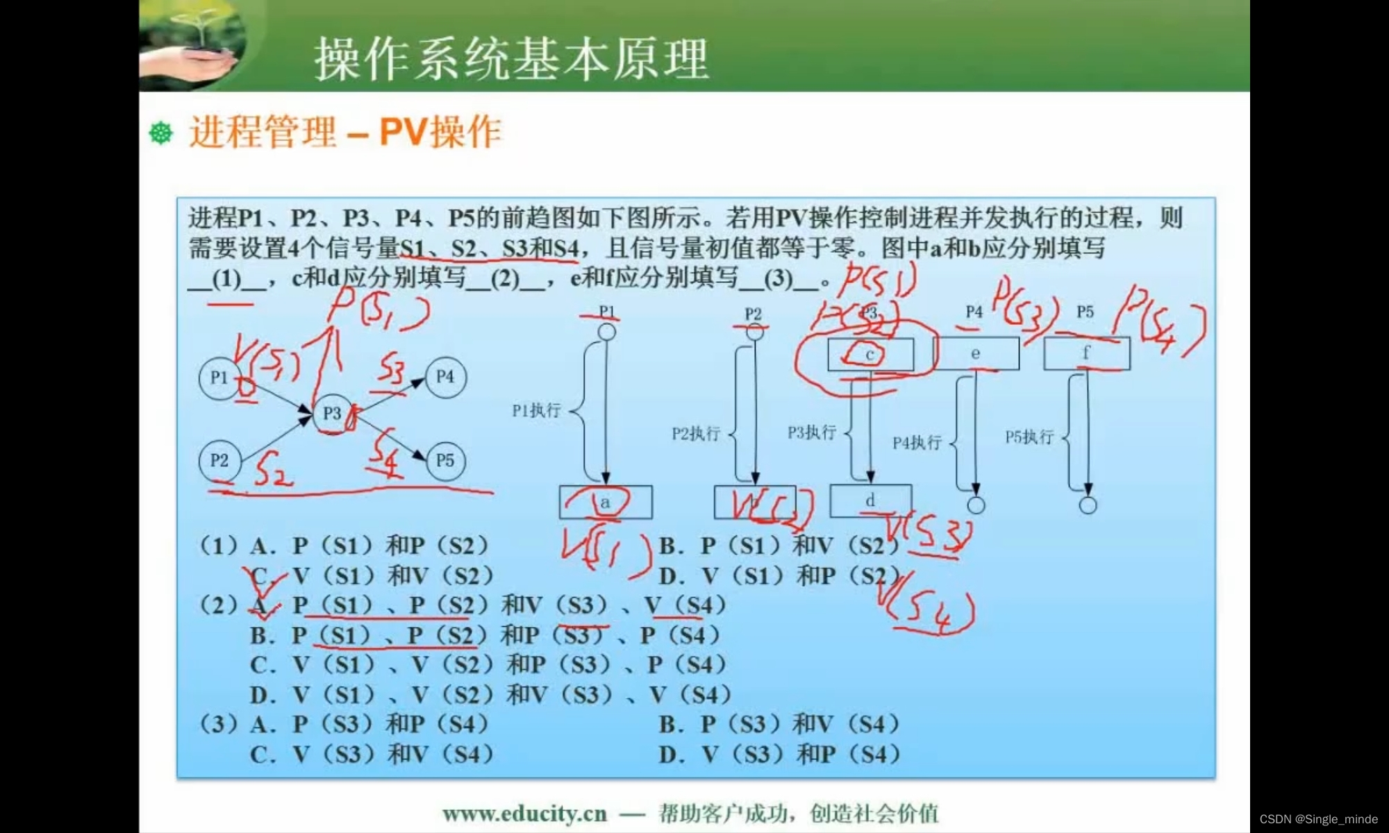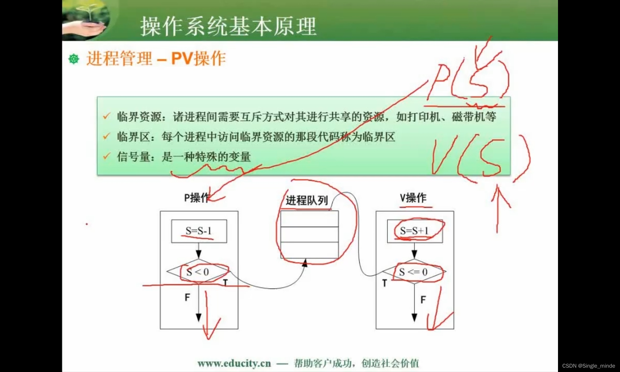 接着,最关键的地方就是对于------>,箭头左边(底端---),为V(S)操作;箭头右端(顶端 >)为P(S)操作,可以通过这个方法快速判断PV操作。