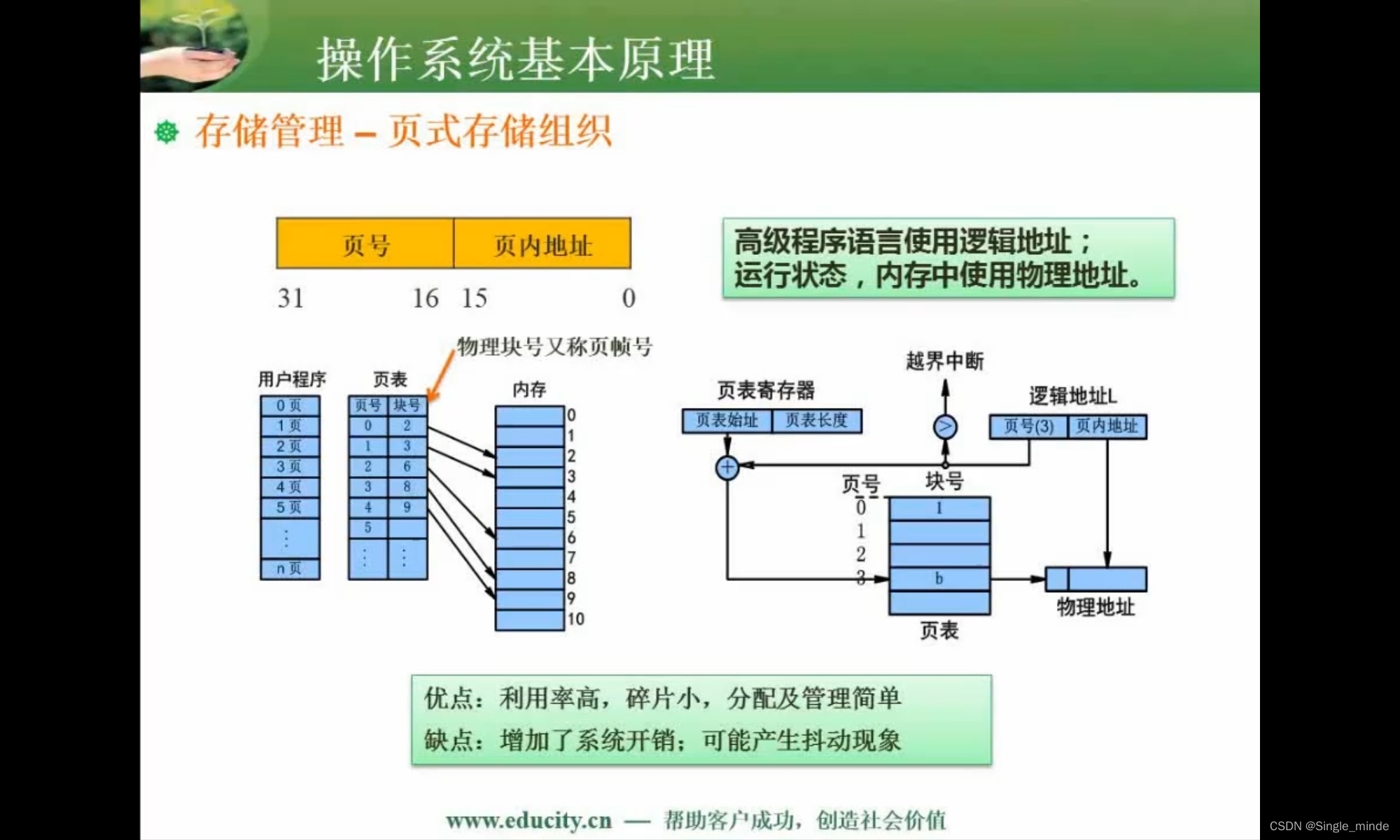 缺点:增加了系统开销(页表记录了他们的关系,要定位时,肯定需要查表。);可能产生抖动。