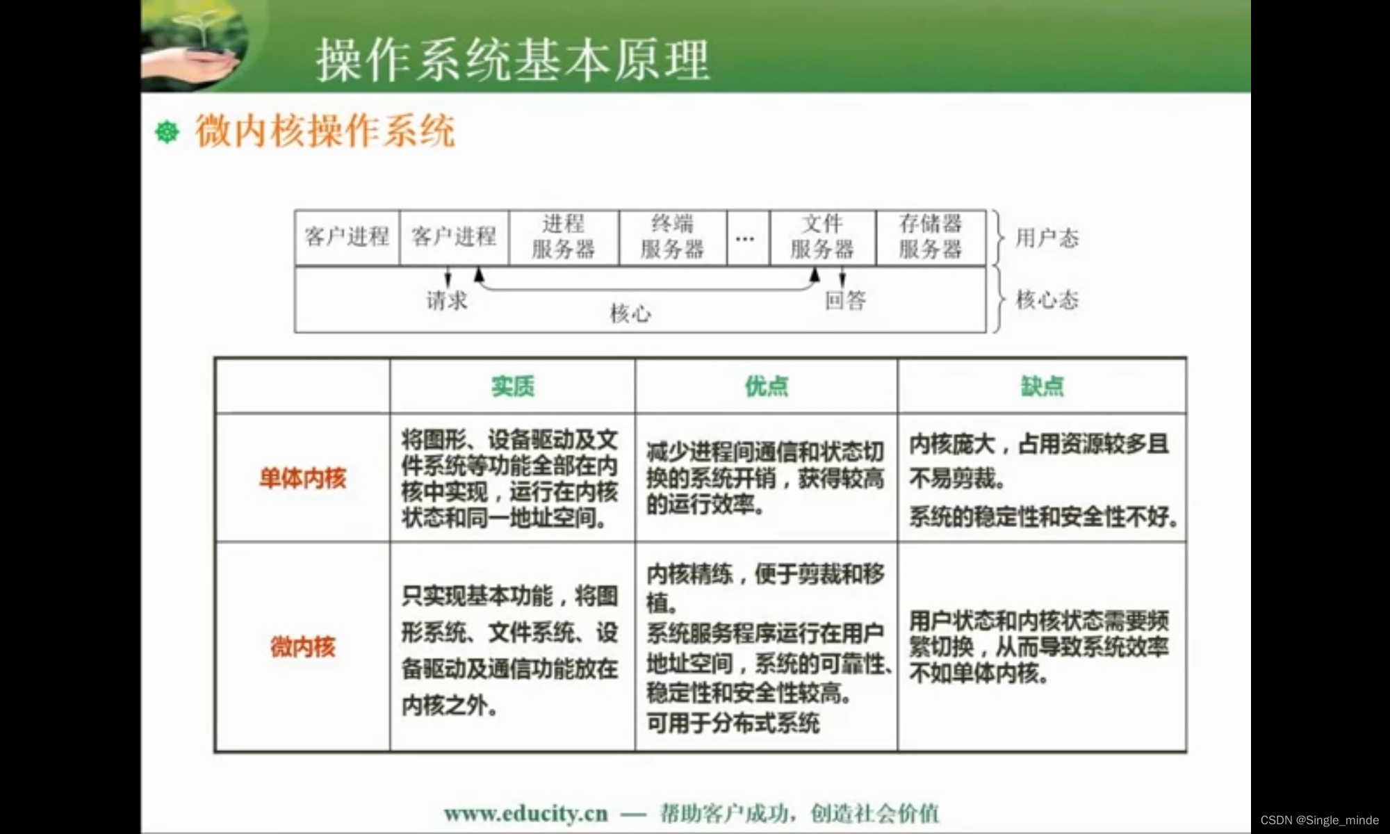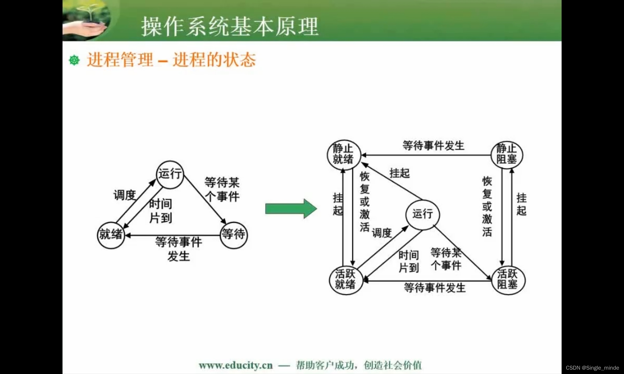 在进程中,左为三态模型为基础,右边五态模型是满足较为复杂的情况,多了静止就绪状态和静止阻塞状态。其中,在等待状态和运行状态中,它没有直接从等待变到运行,因为cpu不允许直接将整个程序放入,因此是采用时间片的方式进行运行。静止就绪,例如打电话时听歌操作,当打电话的时候,把音乐挂上,在打电话完以后,则再调度回来。