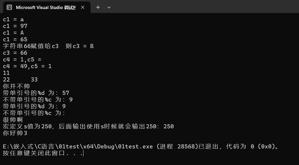 printf("c1 = %d\n", c1);//输出结果是97 当%d时返回的是阿斯克码值
