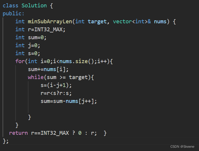 1双指针。上指针控制大局,控制大循环 加在和里。下指针i为控制(数组之和小于target)的数组的序列,i=1就是第一个数组,i=2是第二个数组。因为i不断向后移动,sum值不断更新 所以要在i改变时,改变sum的大小,需减去之前加过的sum[i]。若数组之和大于等于target,sum的值等于