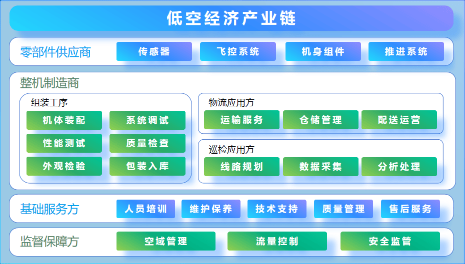低空经济并非单一领域,而是一条涵盖 “上游研发 - 中游制造 - 下游应用 - 保障服务” 的完整产业链: