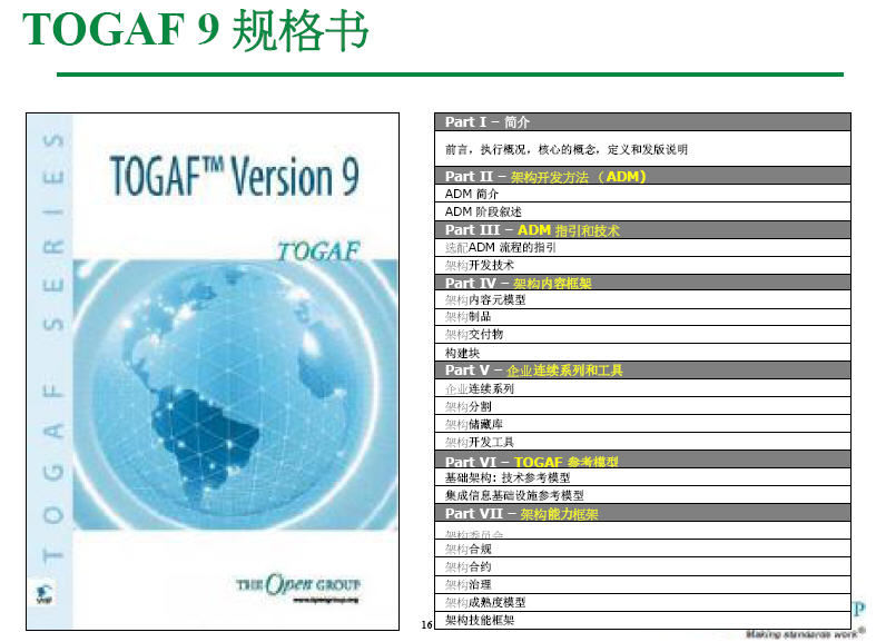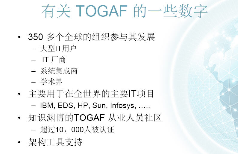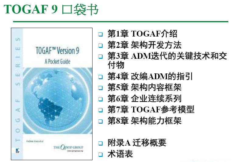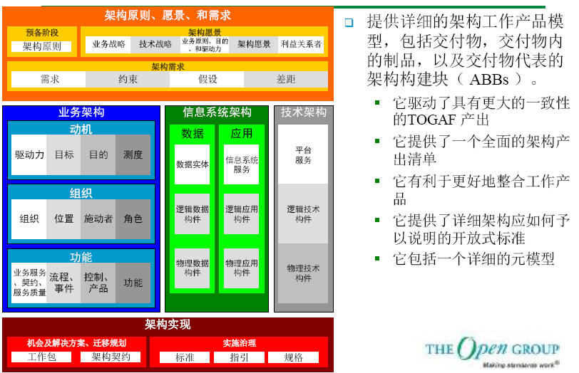 - 从TOGAF8.1.1的一个演变,密切对齐业务,重组的易用性,总体架构和企业架构核心方法,可在今后几年被充实